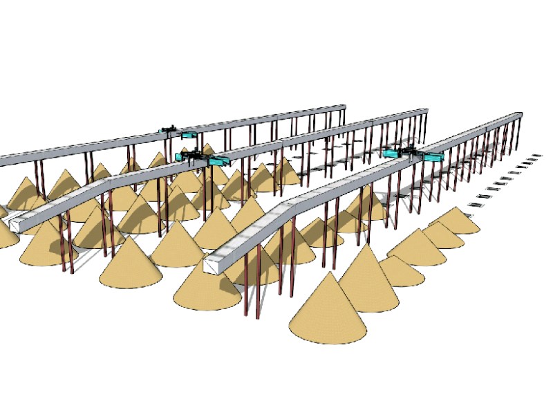 新型露天堆場(chǎng)方案,可以實(shí)現(xiàn)露天及室內(nèi)堆場(chǎng)高效智能化多點(diǎn)卸料布料。